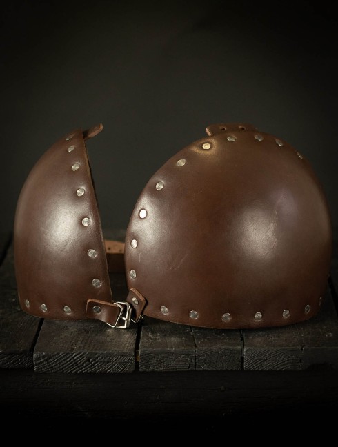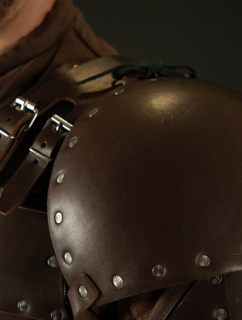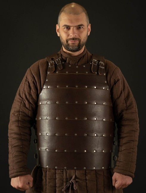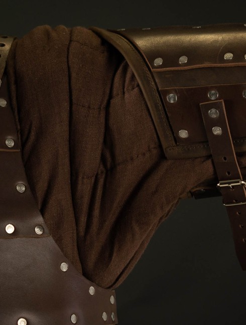 As you understand, body of fighter is protected with leather plate armor, which took the best from the famous brigandines of Visby and Chalkis. These flawlessly reliable steel strips are covered with firm leather. Such brigandine will dare rust, it doesn’t’ glint in the sun, showing you to the enemy, but it looks respectable and impressively. Design of breastplate allows easy fitting of brigandine’s size, depending on the thickness of your padded underarmor.