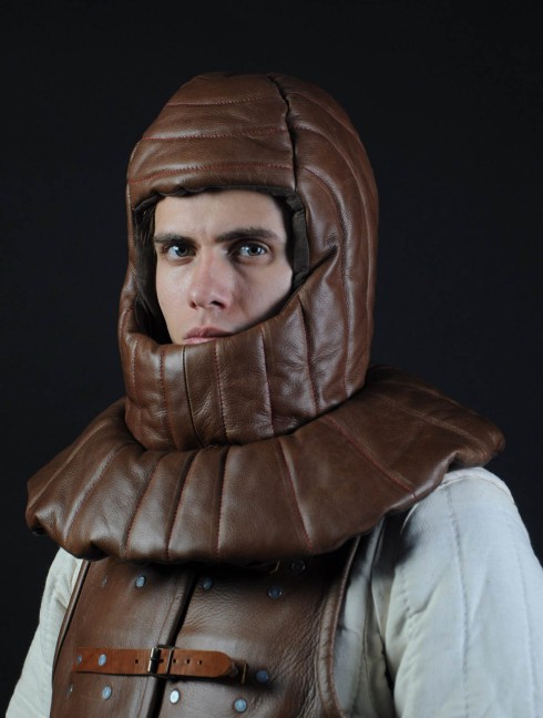 Generally speaking, VIP coif is for VIPs. Lining and wadding are made of the softest cotton; stitching is made with hardest threads. Color of leather may be various, just by your wishes. Think about chic protection of your head, neck and collarbones and order handcrafted leather padded medieval coif.