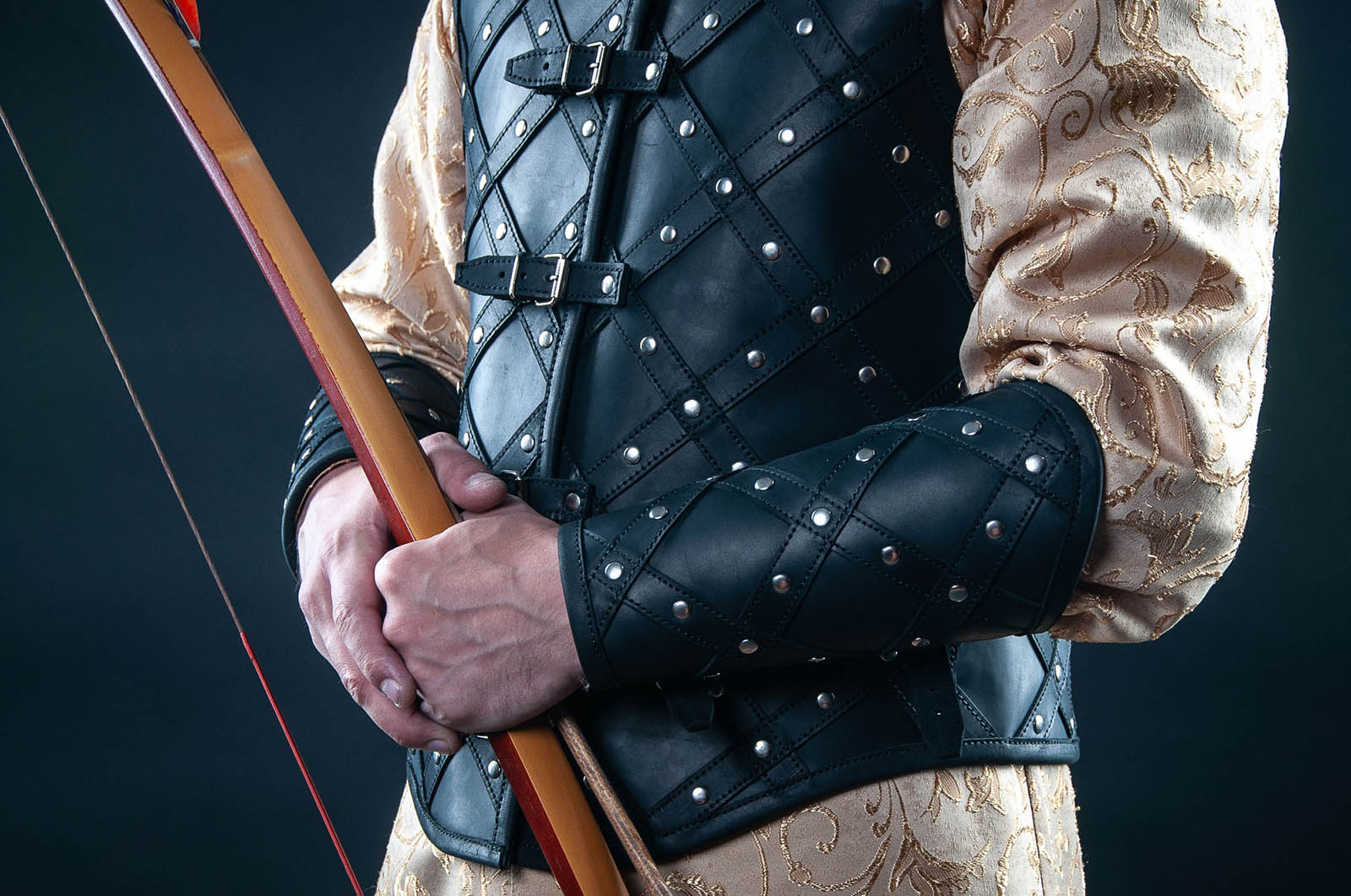 The best armorers of Steel Mastery have made precisely this leather costume. Inspired as by ancient gravures of the medieval knights, so by modern pictures of fantasy warriors, after long meetings, debates and fights, our masters reached conclusion and created perfectly sustainable medieval leather vest, appropriate as for historical event, so for fantasy-style festival with bracers in same style.