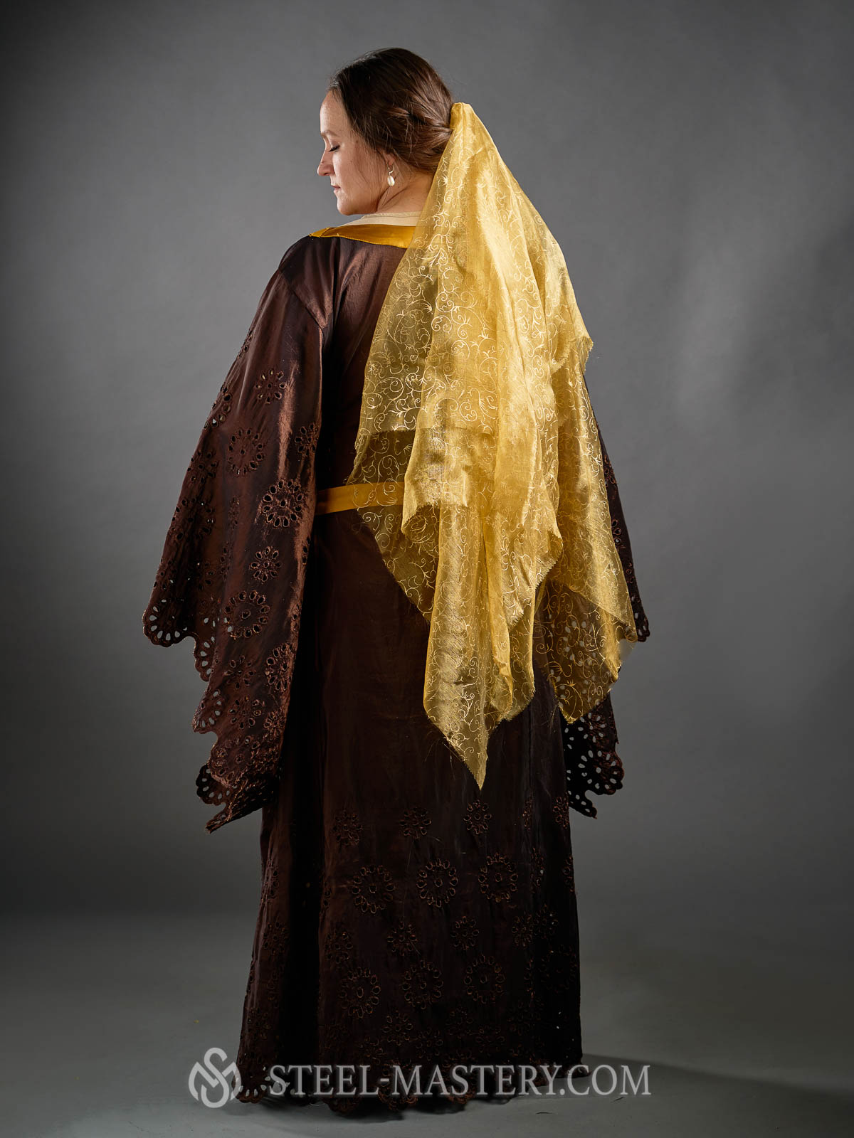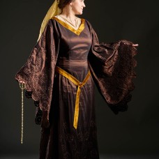The bliaut dress is also complemented with a fabric belt – the same wide golden silk band as the collar decoration. The belt fastens on the modest brass buckle, which does not distract from the openwork embroidery but only emphasizes it. Traditionally, bliaut was made of linen, wool, heavy silk, or velvet and trim consisted only of contrasting stripes on neck, hem, and sleeve edges. The sleeves could also be decorated with festoons. But if you're also leaning towards a fantasy set, then no one limits you in your choice of fabrics and decorations.