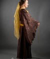 A veil of golden gas fabric covered in swirls of embroidery completes the look.