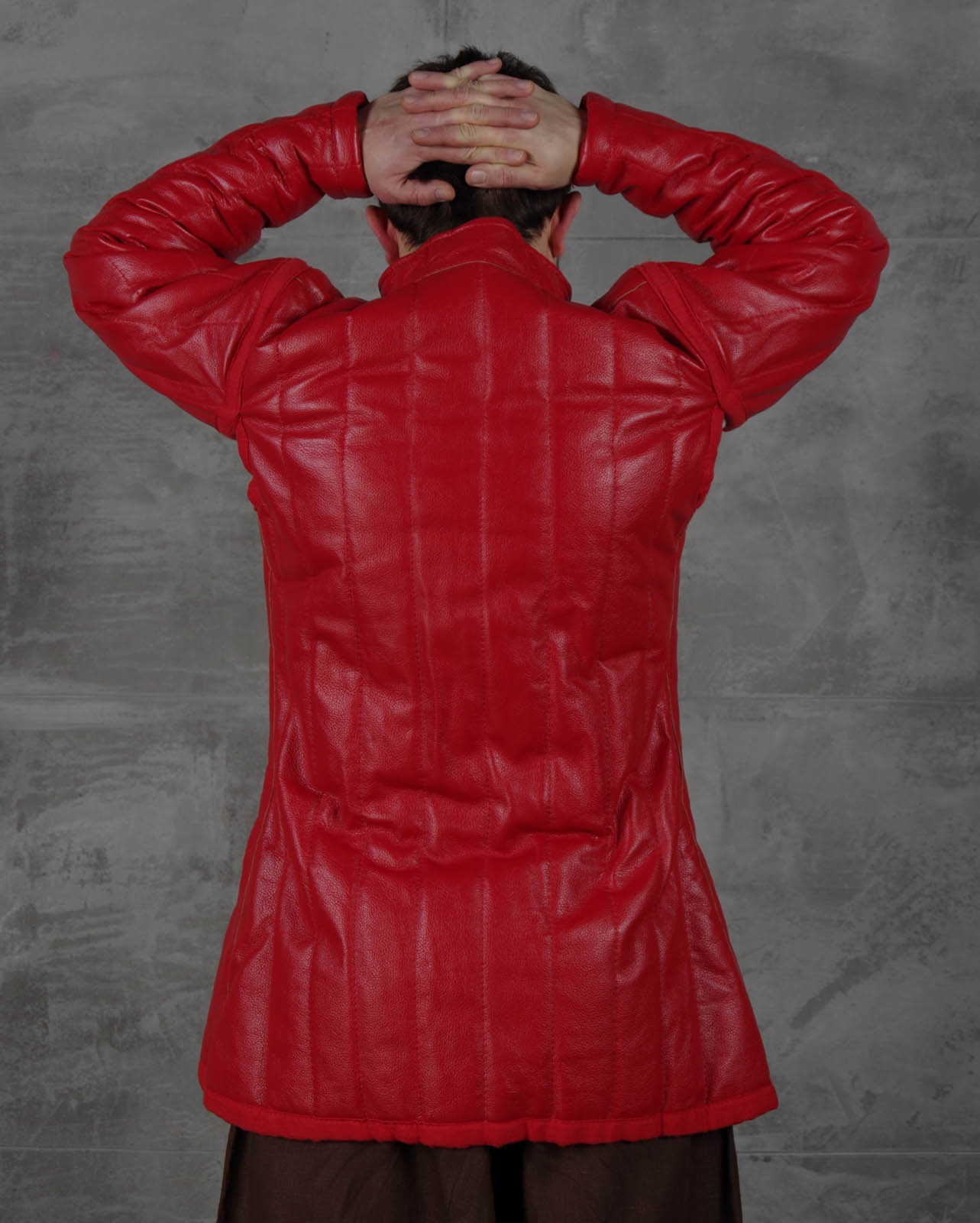 Leather is main material for this type of gambeson. We may make it of black or red leather or of unusual wine-red or yellow leather. Here is one more model: medieval aketon of leather of the XV century. Leather armour for LARP or fantasy style events are in corresponding category.