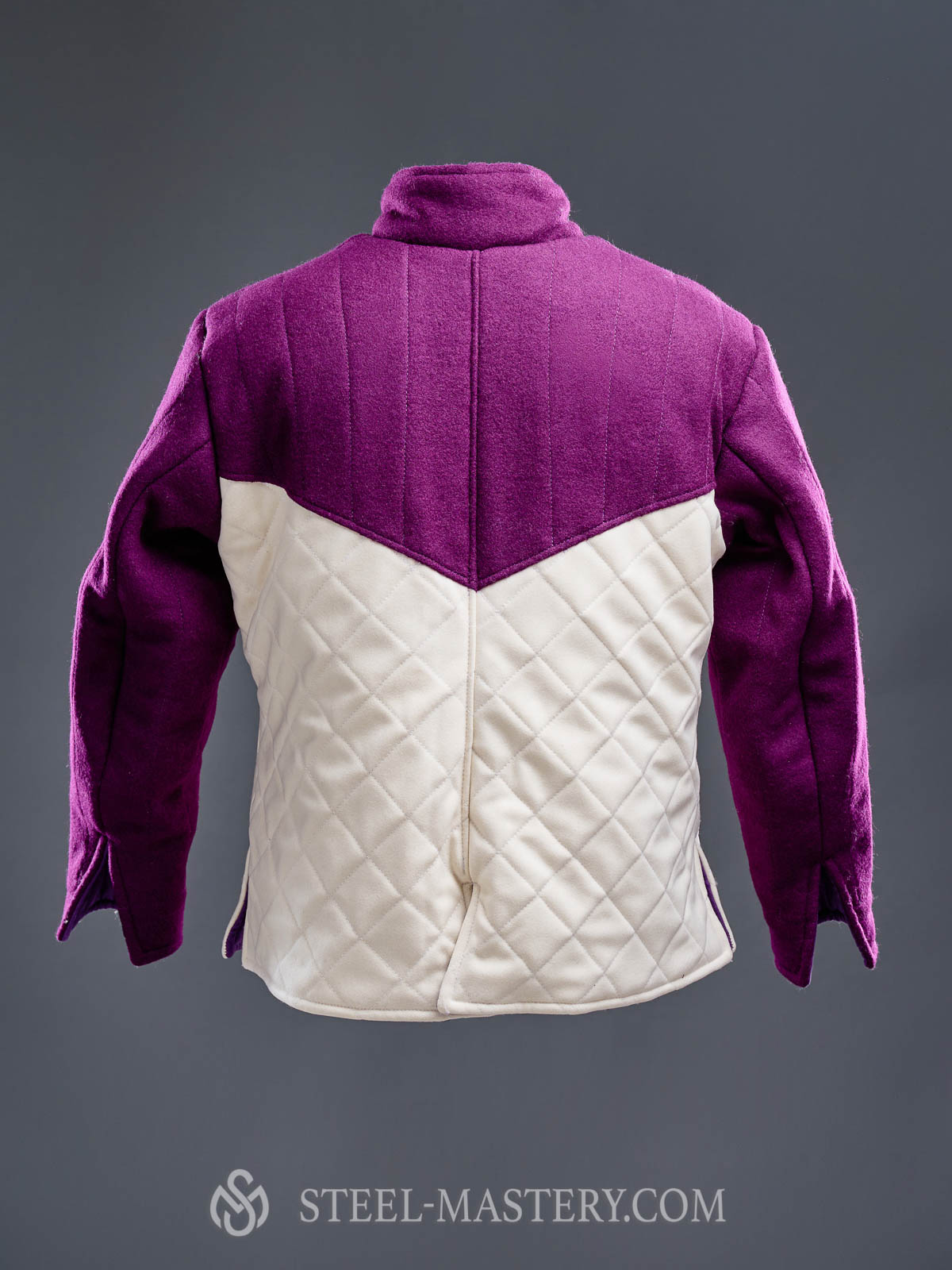This medieval jacket’s slim-fitted cut works on any figure. We used a figured combination of fabric in two colors and two types of quilting to made gambeson jacket more elegance. As well as cuts on the back, sides, cuffs and got short strait collar.