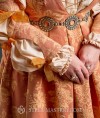 The dress is narrow in the bodice with a deep V-shaped neckline and exaggerated waist, while the puffed skirt falls to the floor in beautiful soft pleats. The dress is laced up the sides to fit the figure. This is a light version with only one dress, but for ladies with a true Italian passion at heart, we are ready to sew as it should be – 2 dresses. We chose a peach patterned jacquard with a large floral pattern for a dress, decorated on the edges with fine gold thread and gold ribbons for garter sleeves and lacing. Naturally, your dress – your type and colors of fabric and decorations, but we are always here to advise.