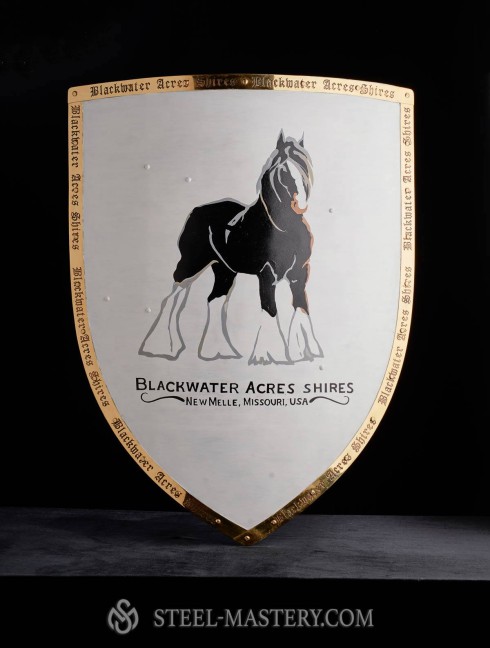 Steel shield is a model of medieval knight defense, more known as triangle or heater shield. Medieval armor of similar shape and different sizes were in wide use by infantry and cavalry starting the XII century. There are many historical sources, where you can see images of heater shield.