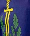 This coat of arms (tabard) is modest to asceticism and chic in its modesty. It is divided into 4 squares in a checkerboard pattern. On the white fields are placed six piercing scarlet dots in a triangle tapering downward. And on the blue fields, in turn, there is a golden punishing sword, pointed down, framed by green oak leaves, five on each side.
