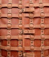 Not a simple dull brigantine, but a soft and thick leather base braided with wide leather straps with bronze rings woven into them. The entire set is made of golden-sand leather in two shades and studded with tiny bronze rings that sparkle across the surface like tiny suns.