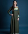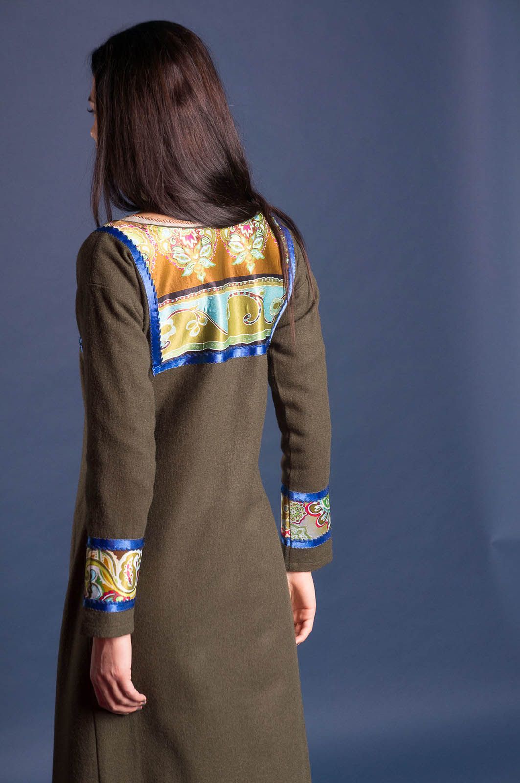 Dress is made of wool (not less then 80% natural wool). It is decorated with inserts of silk on the neckline and cuffs.